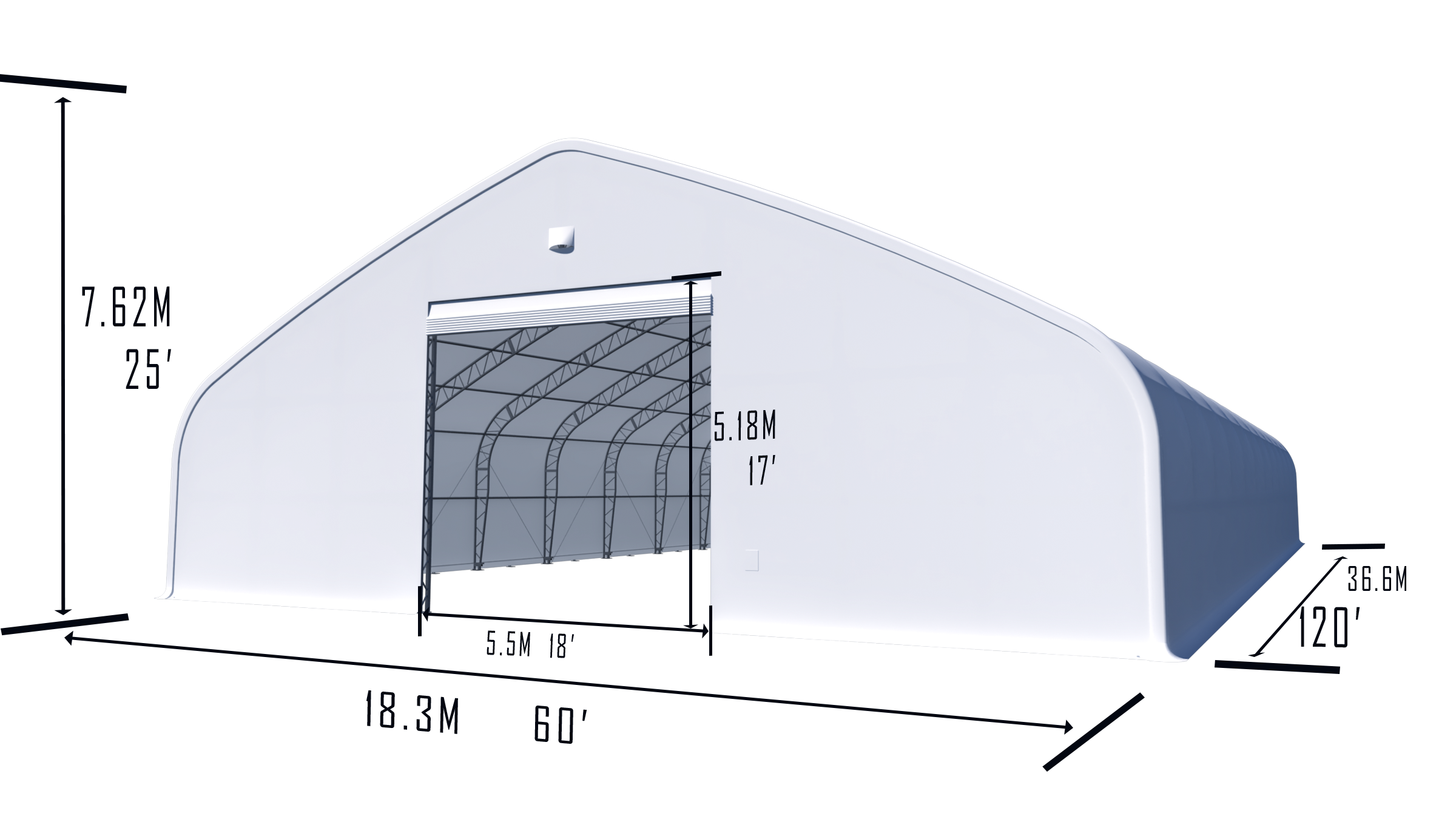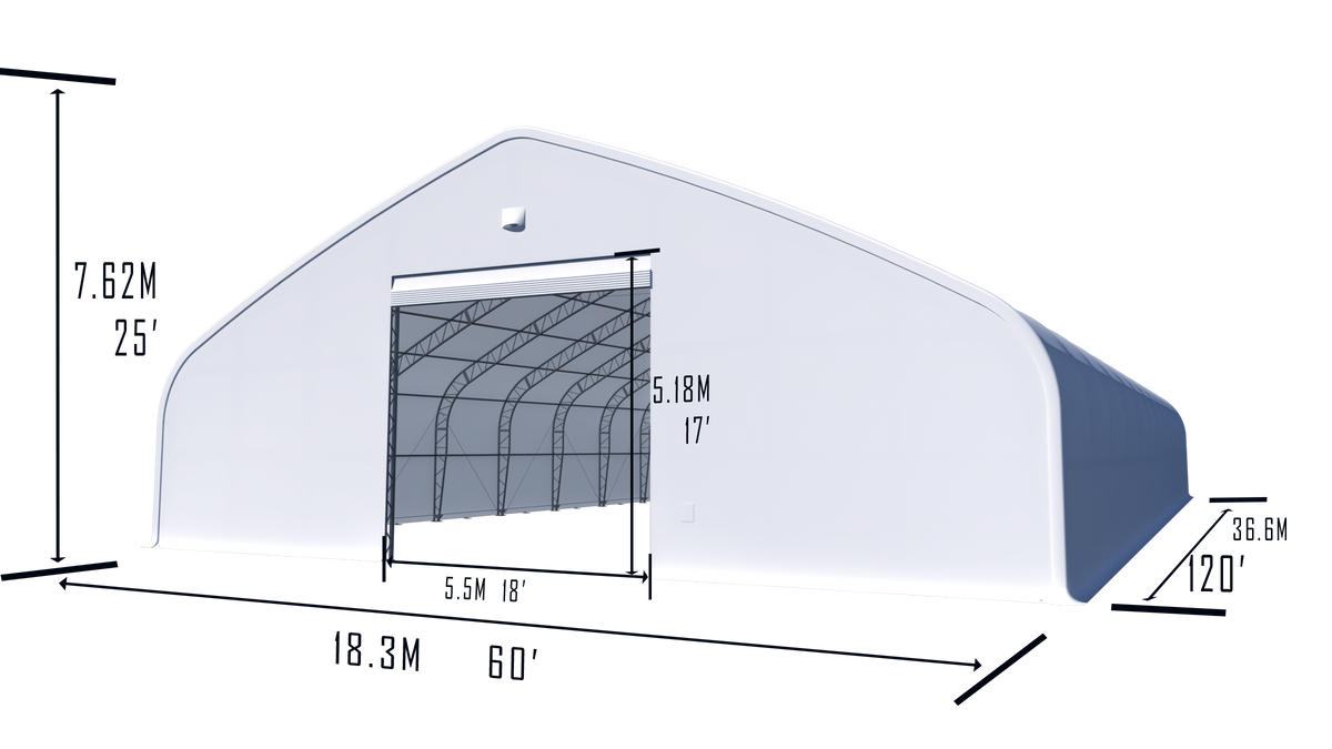 Dimensions du produit | 18.29m*36.58m*7.62m/60'*120'*25' |