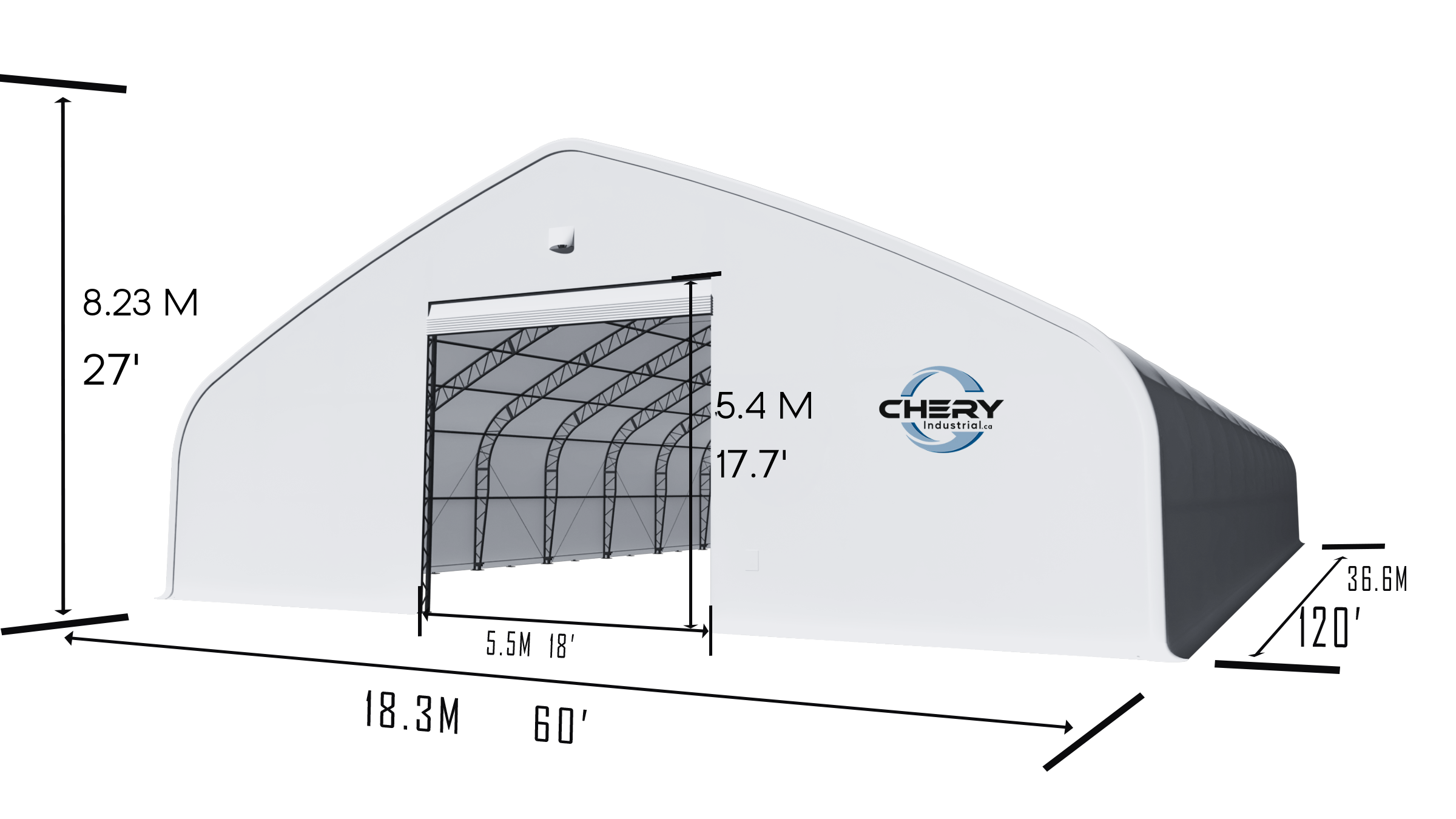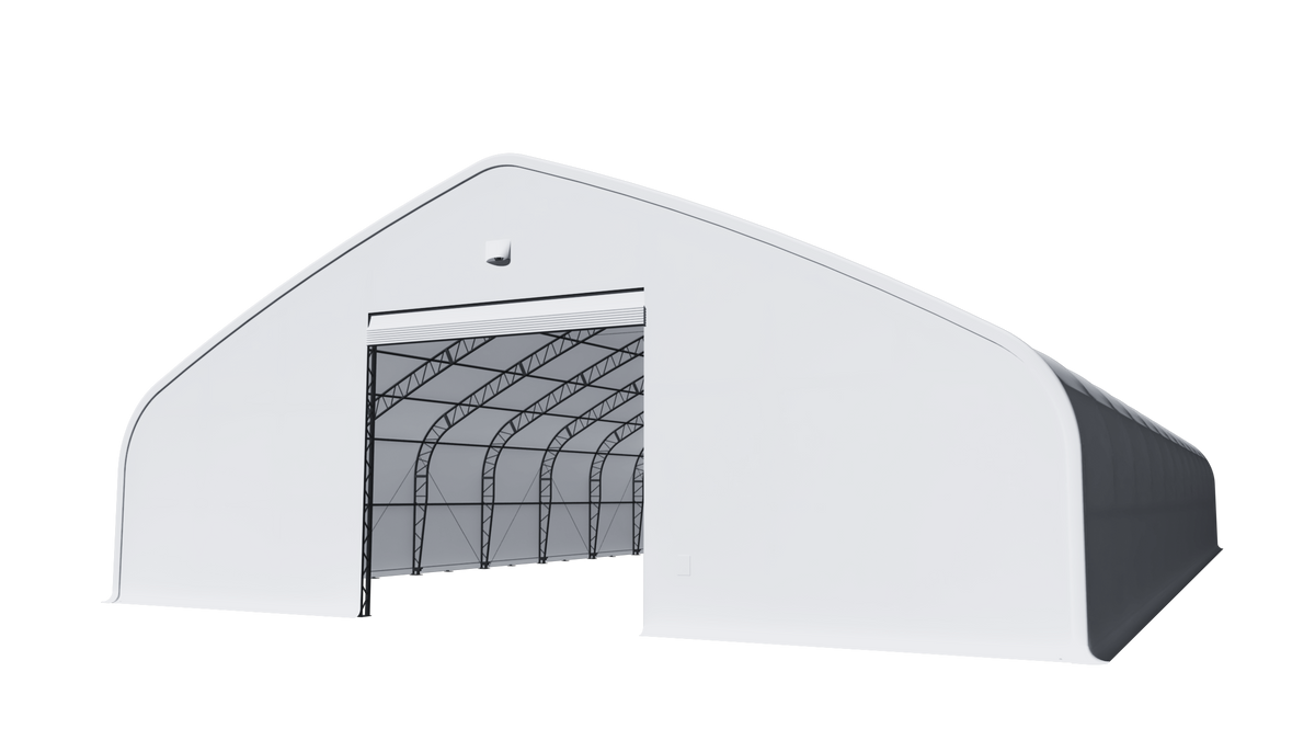 Heavy-duty fabric storage shelter engineered for maximum capacity and durability. The Double Truss Peak M Model features a reinforced double-truss frame design that distributes loads evenly across a 60' wide by 120' long footprint, with 27' peak height for versatile storage of equipment, vehicles, and materials. 750g PVC fabric provides superior weather resistance and UV protection, extending shelter lifespan in demanding Canadian climates. The peaked roof design sheds water and snow efficiently, reducing structural strain and maintenance needs. Ideal for industrial yards, construction sites, agricultural operations, and seasonal inventory storage. Quick-deploy frame system minimizes installation time while maintaining structural integrity under heavy wind and snow loads. Nordura engineering delivers premium Canadian design built for reliability and long-term performance.