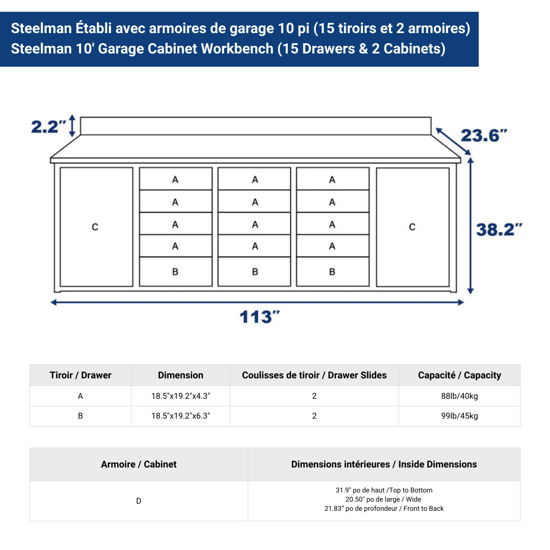 Steelman 10' armoire de rangement avec établi (15 tiroirs & 2 cabinets)