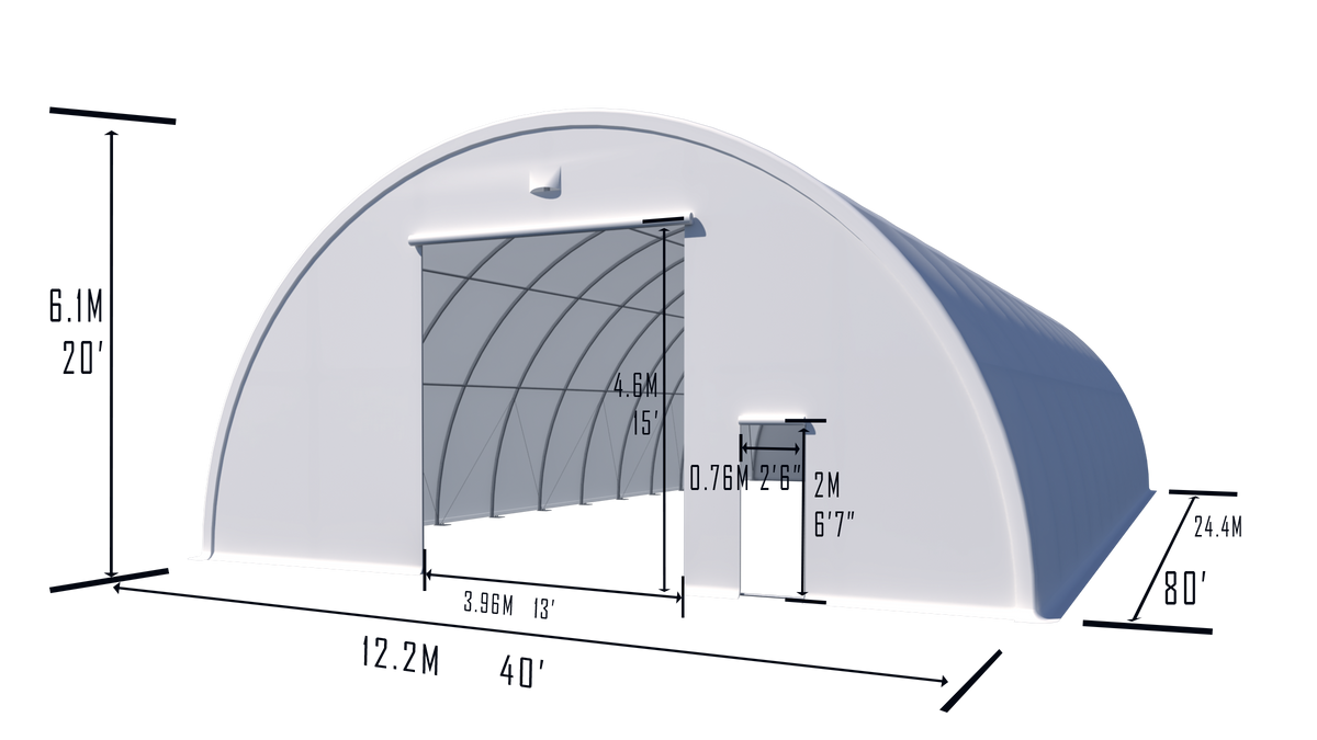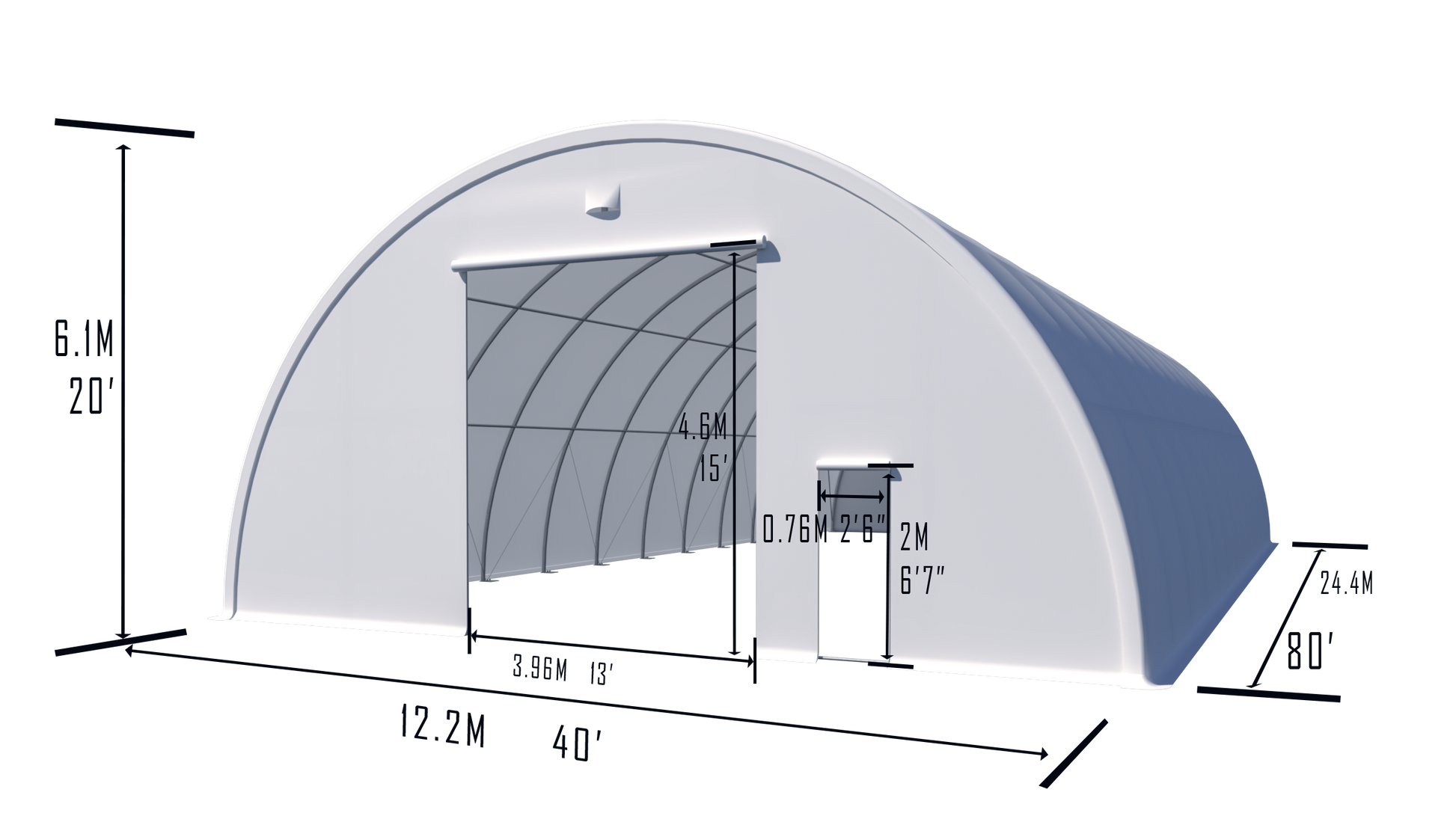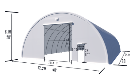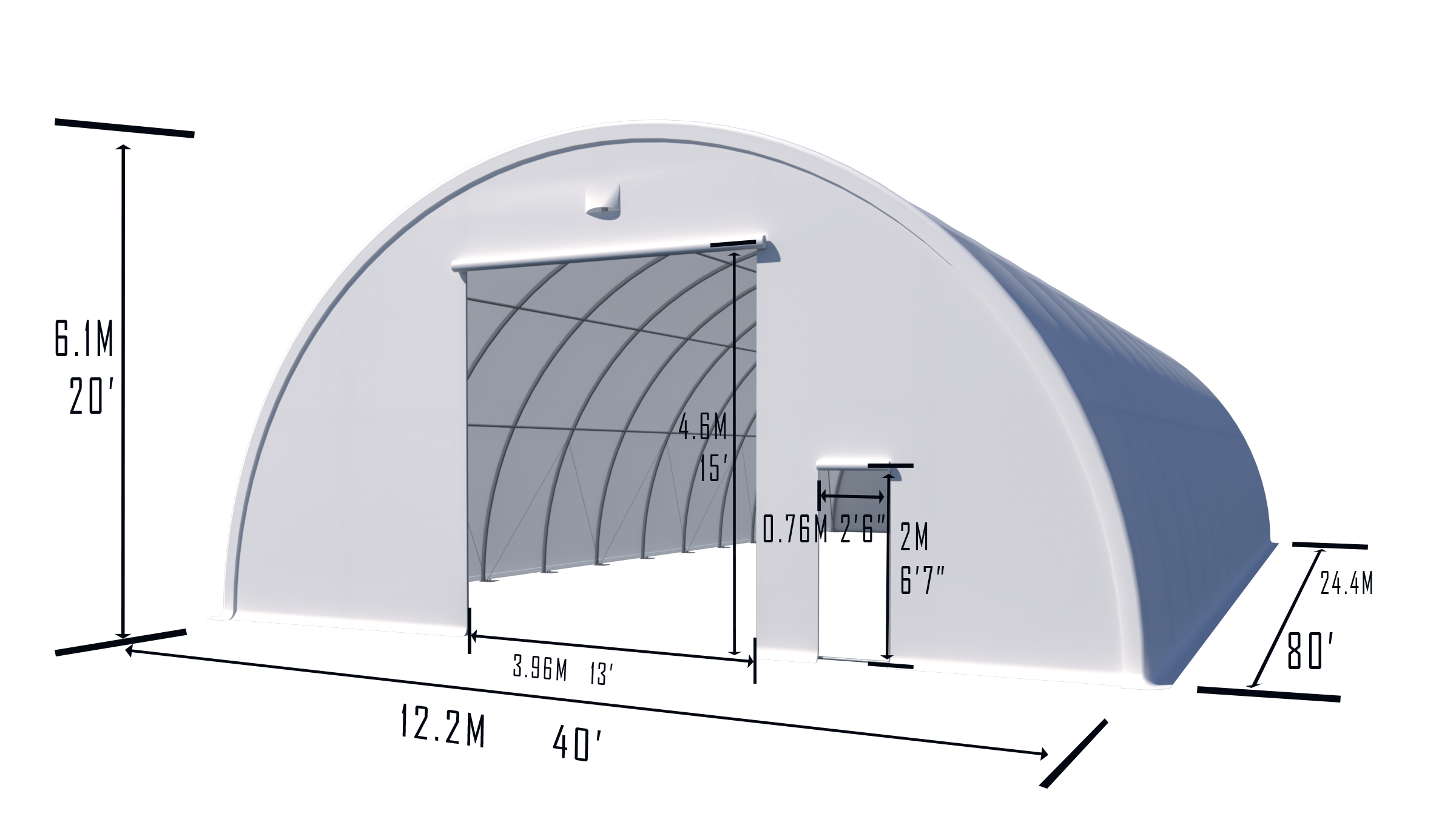The Gold Mountain Single Truss Arch Storage Shelter W40’xL80’xH20’ (408020) is the perfect choice for anyone looking for a reliable and durable storage solution. This truss construction storage shelter is designed to be resistant towards water, UV, and fading, and can last up to 7-10 years under the right conditions. It features a freestanding style, mechanical doors at both ends, and a huge capacity for trucks, automobiles, and more bulk storage. This storage shelter will protect your belongings from wind, snow, and rain, and has a CSA/TUV Snow Rating Test Report and SGS fabric Certificate to guarantee its quality. Whether you need to store equipment, materials, or recreational items, the Gold Mountain Single Truss Arch Storage Shelter W40’xL80’xH20’ is the perfect choice.