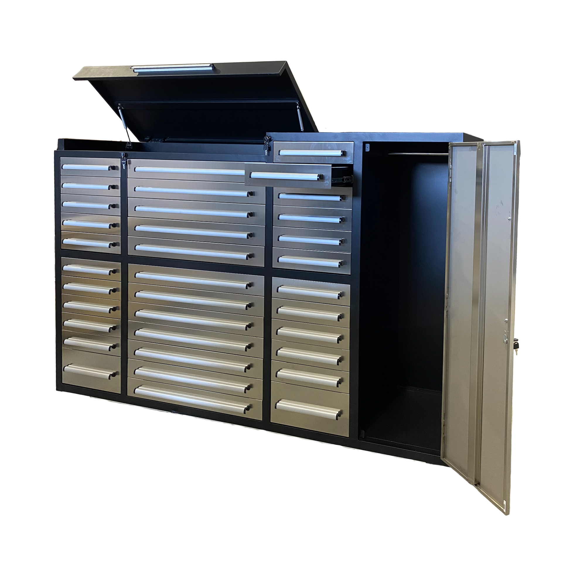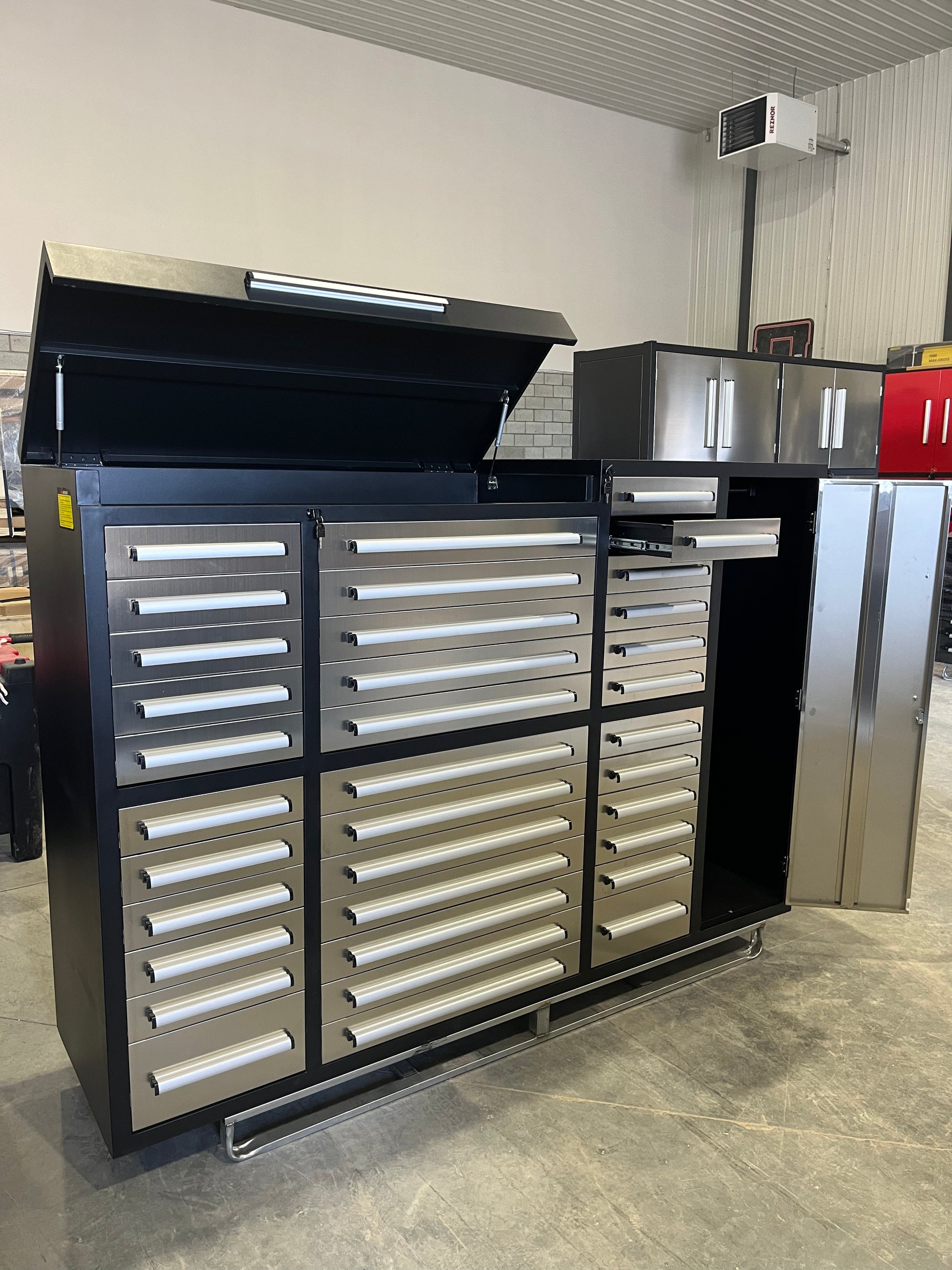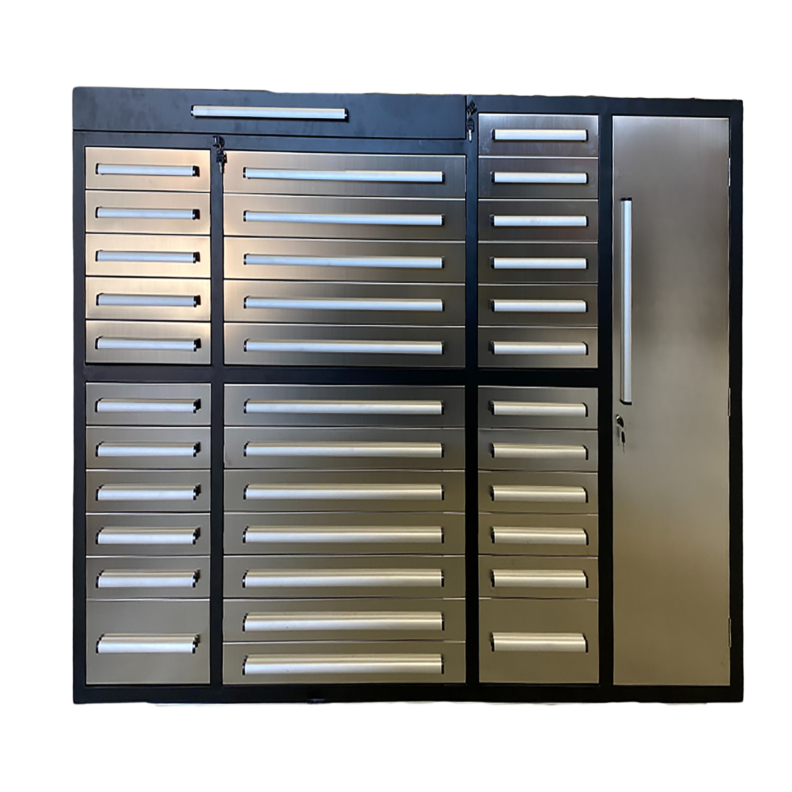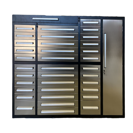 The Steelman 7' Stainless Steel Garage Cabinet (35 Drawers) offers an unparalleled storage solution for those seeking maximum capacity and durability in their workspace. Designed with an industrial-grade stainless steel construction, this cabinet is highly resistant to rust and corrosion, ensuring long-lasting performance even in demanding environments. With 35 drawers, it provides extensive storage space for organizing tools, equipment, and supplies efficiently. Each drawer is equipped with anti-slip inners and pre-cut liners to keep items securely in place, while the new 3-rail sliding system ensures smooth and secure drawer operation. The cabinet's robust design includes double slides on large drawers, providing the strength to handle heavy loads.