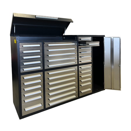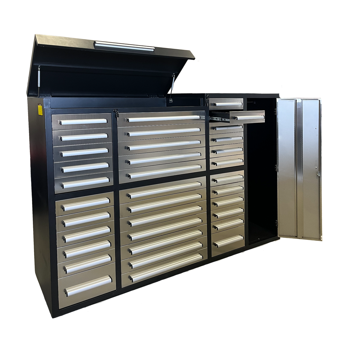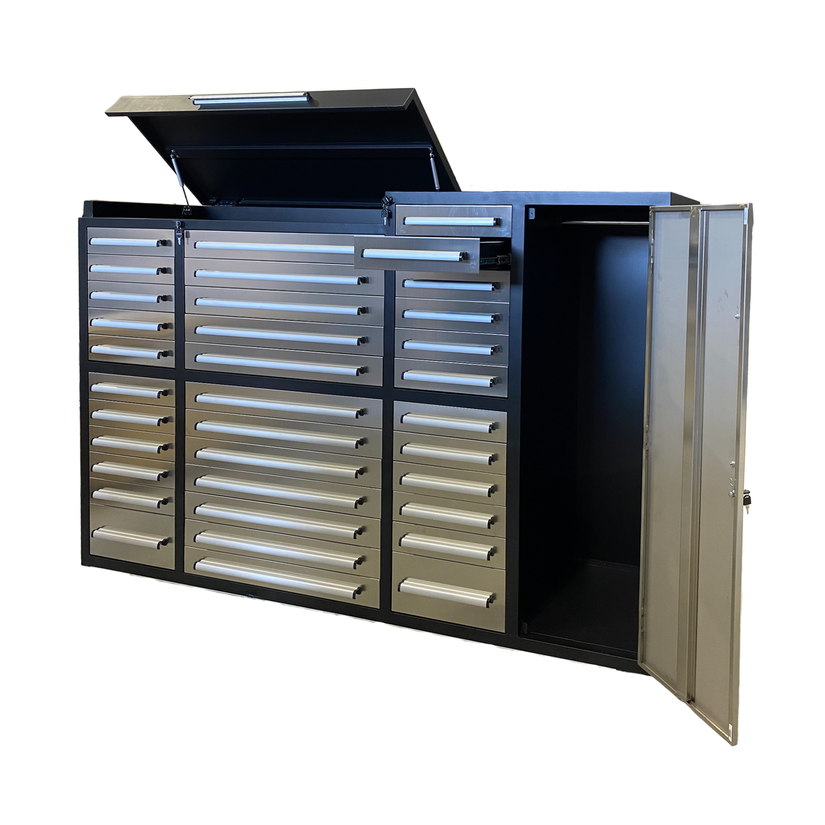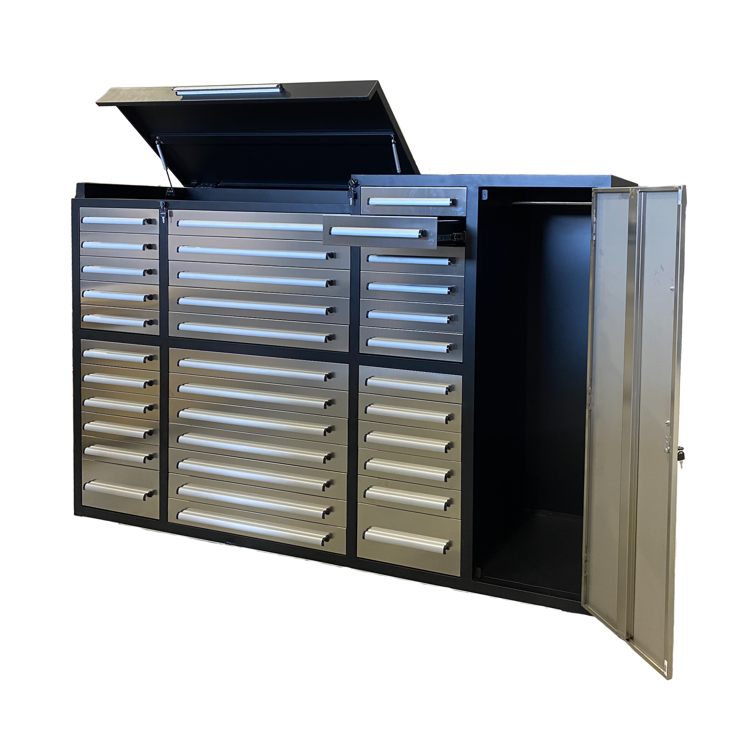 The Steelman 7' Stainless Steel Garage Cabinet (35 Drawers) offers an unparalleled storage solution for those seeking maximum capacity and durability in their workspace. Designed with an industrial-grade stainless steel construction, this cabinet is highly resistant to rust and corrosion, ensuring long-lasting performance even in demanding environments. With 35 drawers, it provides extensive storage space for organizing tools, equipment, and supplies efficiently. Each drawer is equipped with anti-slip inners and pre-cut liners to keep items securely in place, while the new 3-rail sliding system ensures smooth and secure drawer operation. The cabinet's robust design includes double slides on large drawers, providing the strength to handle heavy loads.